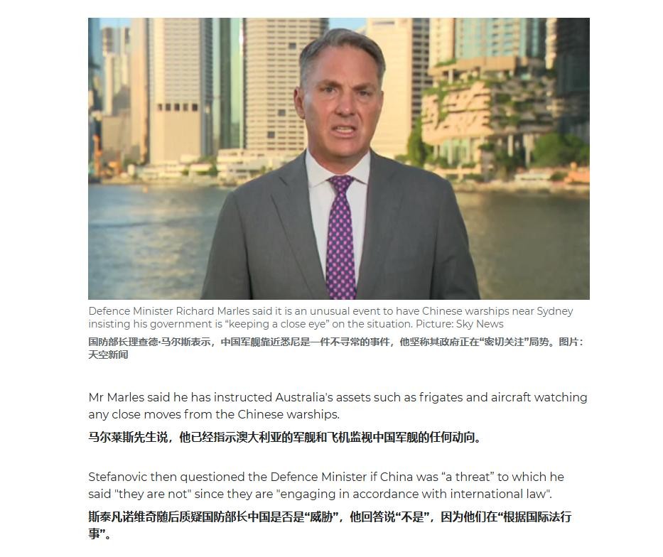 说来有趣的是,就在《金融时报》披露了中国舰队首次出现在澳大利亚东南沿海海域的报道之后不久,澳防长理查德·马尔斯(Richard Marles)出面接受了英国天空电视台的采访。天空台主持人斯特凡诺维奇(Peter Stefanovic)质问他:“你不觉得中国军舰离澳大利亚那么近对你们而言是一种威胁吗?”对此马尔斯的答复则是: