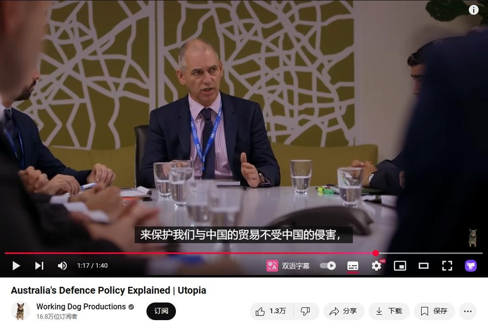 这场戏出自《乌托邦》第3季第7集《军国大事》(On The Defence),该剧集于2017 年 8 月30 日首播,播出当天《乌托邦》的制作方“劳狗”工作室(Working Dog Productions)还整了个活——他们抢在澳媒ABC电视台之前,把这段名场面在油管上发了出来,并为它配了一个戏谑指数拉满的标题——“(一分钟)带你看懂澳大利亚的国防政策”。
