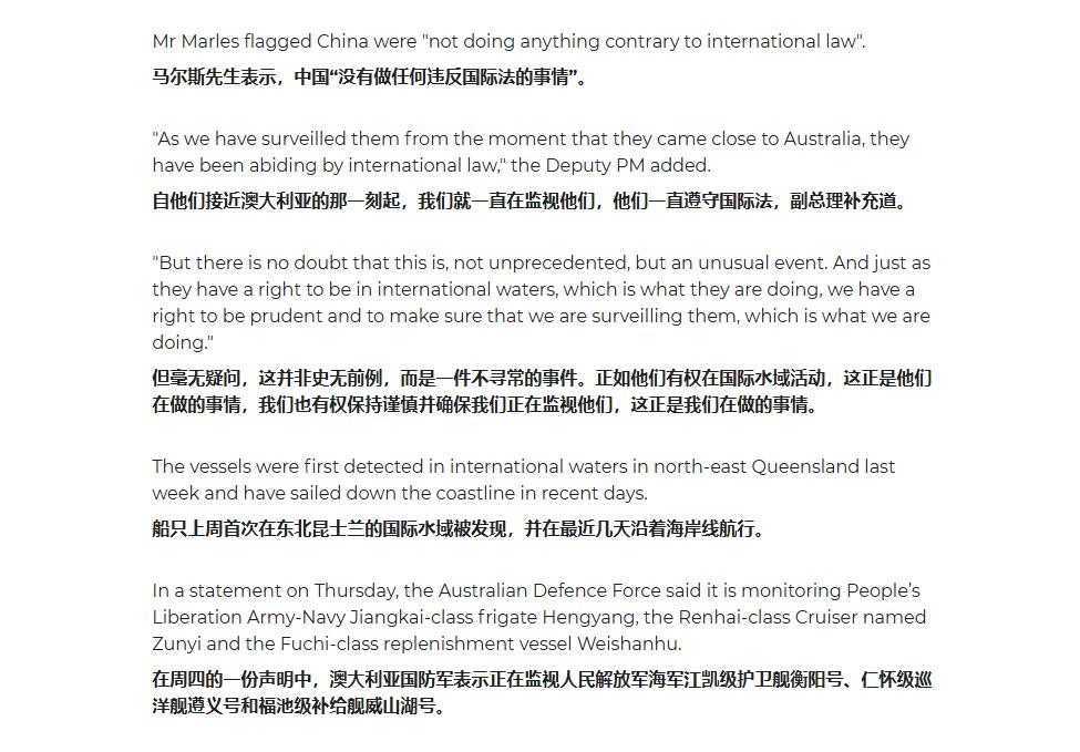 “至于‘威胁’什么的,在此我要郑重强调:中国海军不是我们的威胁,那些中国军舰也没有对我们构成威胁。他们只是一般路过,并没有做任何‘违反国际法的事情’。自他们接近澳大利亚的那一刻起,我们的军舰和飞机就一直在跟踪监视他们,他们的行动的确是符合国际法的,对此我们可以保证。”