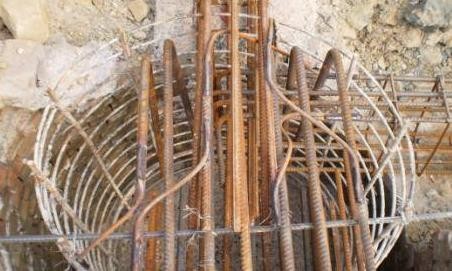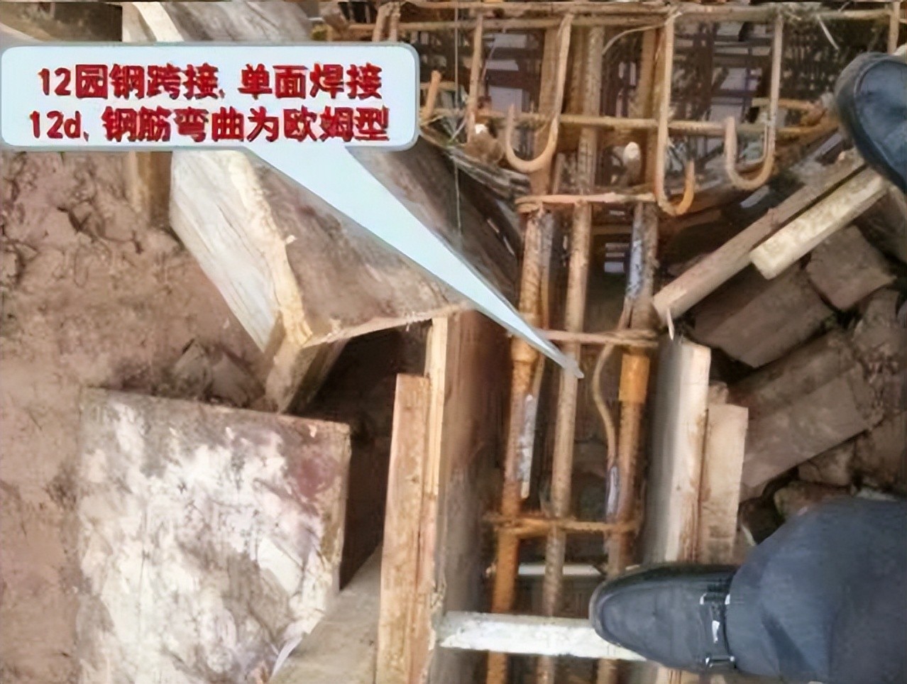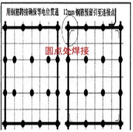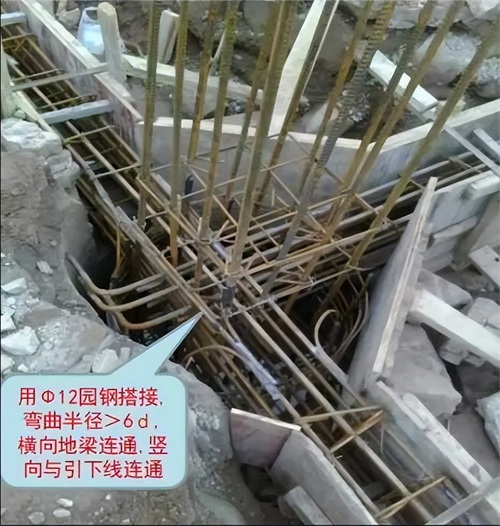 1、按图纸所标注位置定位引下线位置,引下线采用2根不小于φ16的筋(如柱内主筋无φ16钢筋则焊接4根φ14钢筋作为引下线,直径不得小于12mm)引下线与地梁钢筋、柱筋连接采用不小于φ12的圆钢搭接,双面焊接焊缝长度大于圆钢直径6d,圆钢弯曲半径大于圆钢直径6d,并用油漆标记(方便查找)。(主筋冷搭接处必须焊接、丝接必须跨接焊接,当主筋连接采用压力焊时其接头处可不焊跨接线及其它的焊接处理)。