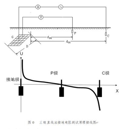4、根据其测试原理可知,电位降法和三极直线法都是在电压极P处于对地电压零电位的位置时所测得的数值进行接地电阻计算的,而三极夹角法通过数据的修正来计算,但其电压极P也应处于零电位位置。因此,准确寻找零电位的位置是各种测量方法确定电压极引线长短的基础。