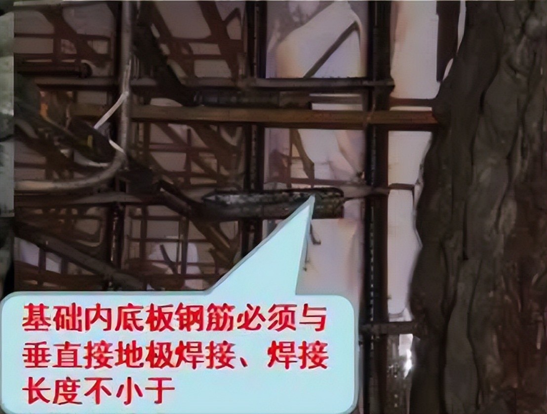 水平接地极由筏板基础上部钢筋网构成,以柱筋作为垂直接地极。在施工阀板基础水平钢筋网时,直接将其水平钢筋焊接连通,焊接长度大于140mm。