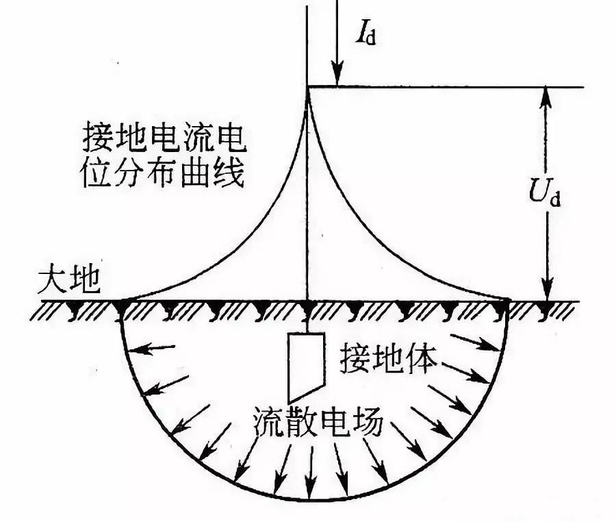 2、当电流经接地体而流入大地时,电流呈半球状从接地体向四周扩散,如图所示。越靠近接地体,扩散电流密度越高;距接地体越远,扩散电流密度越低。在距接地体20m处,扩散电流密度近似为0。所以把接地体周围20m范围内接地体与大地接触的接触电阻和大地流散电阻称为接地电阻。