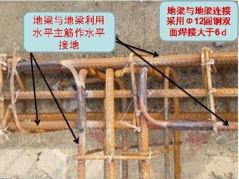 水平接地极由地梁的主筋构成,垂直接地极由每桩内2根钢筋构成。 接地极施工时,桩内的钢筋与地梁的钢筋采用不小于Φ12 园钢搭接,应用双面焊,焊缝长度≥6d,单面焊接焊接长度≥12d。柱与梁、梁与梁、柱与挡土墙地梁之间应用圆钢焊接连接,焊接必须采用双面焊,以保证总等电位连接地可靠性和安全性。