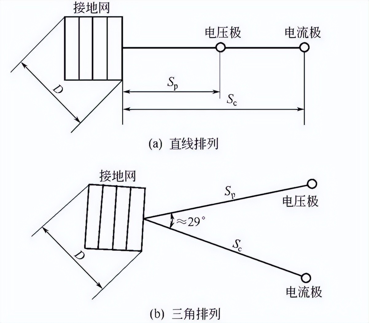 2)测量大型接地网的接地电阻时,宜用电压电流法,电极采用三角形布置。与直线法比较有下列优点: