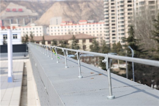 3、避雷带安装高度为女儿墙+150mm,固定支持卡直线间距1m一个,转弯中心处0.5m一个,并涂刷红丹防锈漆两遍,最后统一补刷银扮漆。