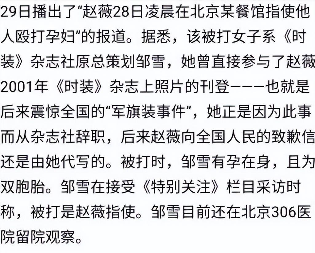说来也是搞笑,这个被殴打的孕妇名为邹雪,是赵薇的好朋友,也是2001年赵薇登上的那本《时装》杂志的主编。