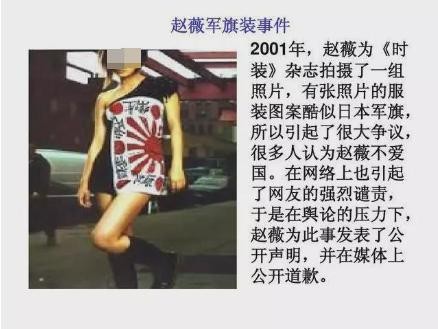 首先最出名就是赵薇那臭名昭著的身穿日本国旗事件。