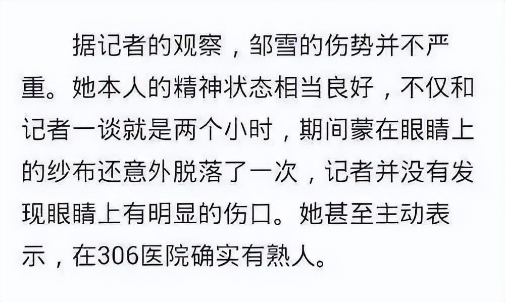 还有称邹雪是故意装病的,说法有很多不知道到底是哪一个。