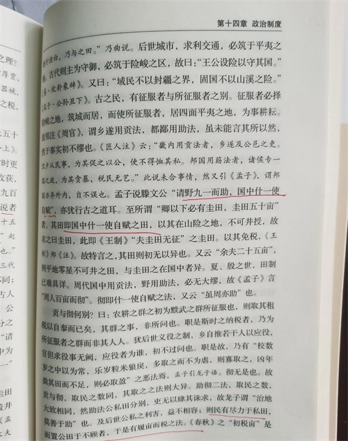 吕思勉《先秦史》:西周土地制度,春秋公羊传注“一夫一妇,受田百亩,公田十亩,庐舍五亩(中建房屋,周围栽桑树梓树)”,孟子“方里而井,井九百亩,其中为公田,八家皆私百亩,同养公田”,总体为十一之税,采用助法,即义务种植公田作为田税。后期开始出问题,及后世,公私之利害益不相容,则民有尽力于私田,而置公田于不顾者,于是有履亩而税之法,《春秋》之“初税亩”是也。此时公私田之别犹在,至阡陌开,而公私之别荡然矣。