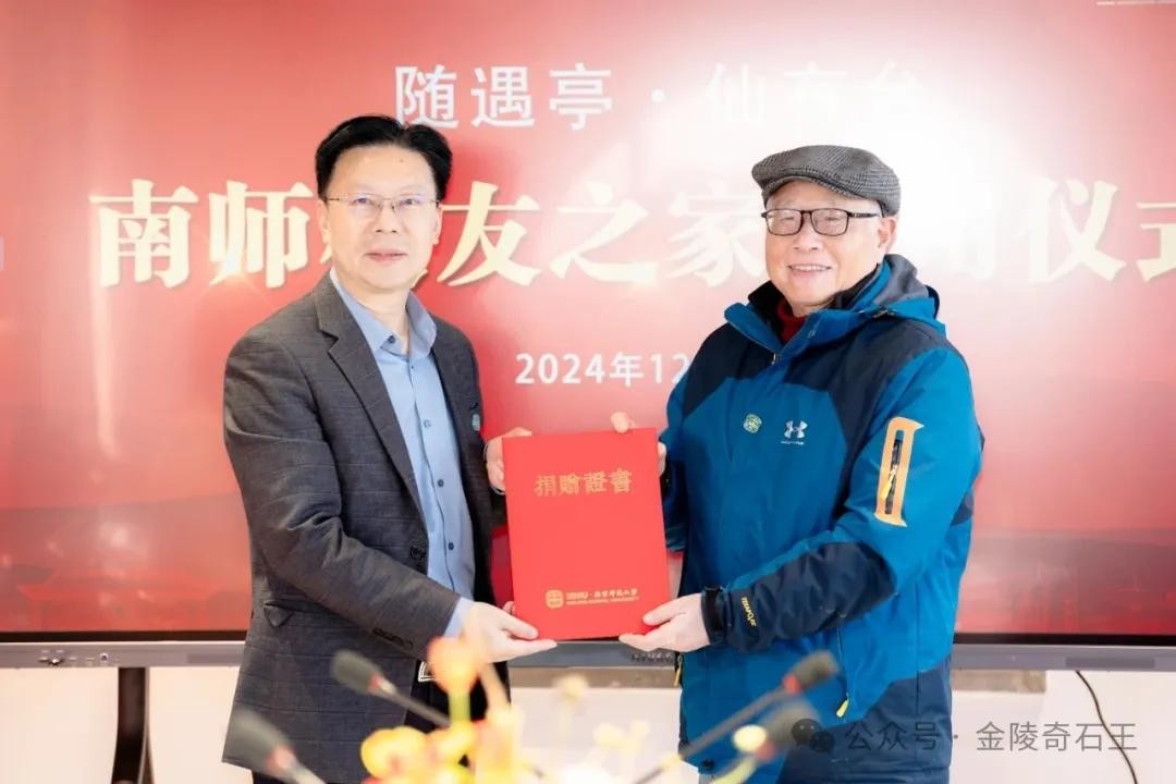 “南师校友之家”包含“随遇亭”“仙有台”和一块巨型红太湖景观石。“随遇亭”和“仙有台”均由美术学院袁琦校友供职的广州市园林建设有限公司慷慨捐建。旁侧,由我捐赠的巨型红太湖石上,镌刻着中国美术馆馆长、南师大美术学院吴为山校友题写的“仙有台”字样。与之相望的“随遇亭”“南师校友之家”亦均出自吴为山之手笔,校友之家内部陈设也是企业家慷慨捐赠。