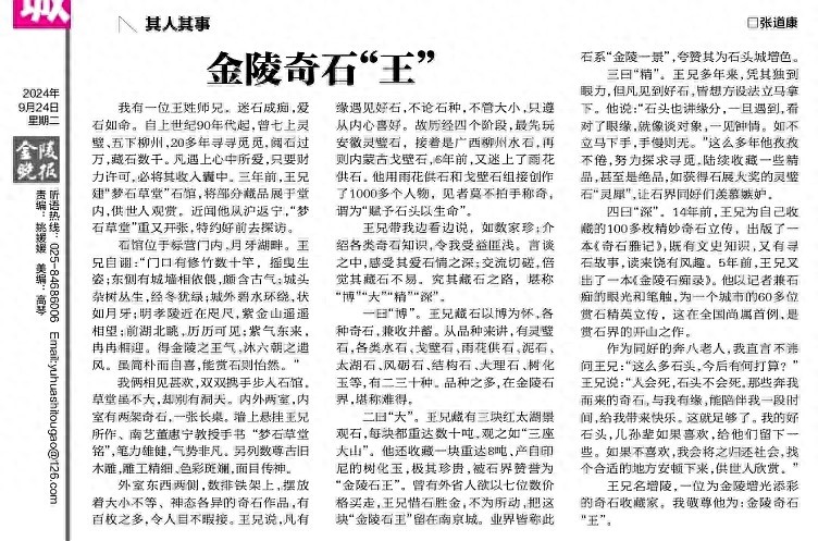 2024年9月24日,《金陵晚报》副刊《雨花石》上,刊出一篇南师大校友张道康写的文章《金陵奇石“王”》。这是写我的文章。我是记者,写别人是平常事,被别人写到报纸上,好像还是第一次。