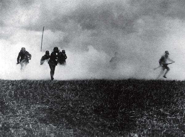 战斗中佩戴防毒面具的德军士兵