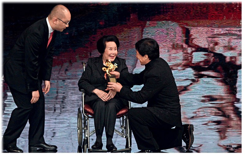 李丽华最后一次出现在公众面前,是2015年金马奖颁奖典礼上。91岁的她坐着轮椅上台,成龙半跪着为她颁终身成就奖。