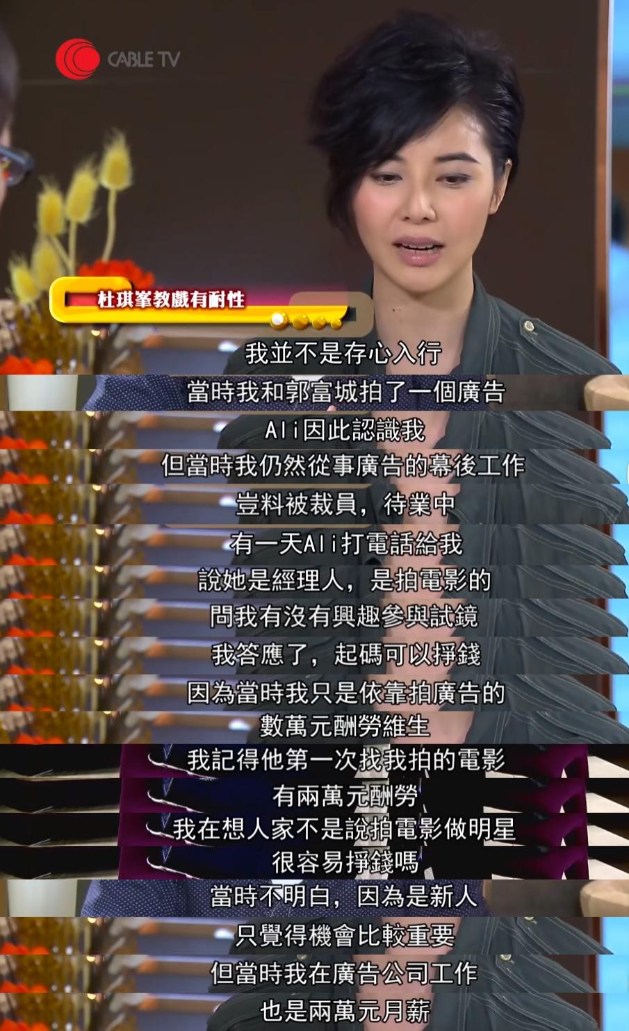 因为被裁员后,后来成为她经纪人的Ali就打电话找她,问她没有兴趣去参加电影试镜,正愁没工作没收入的她欣然应下,她还清楚记得自己拍的第一部电影拿到了两万块钱的酬劳,跟她在广告公司的月薪差不多。
