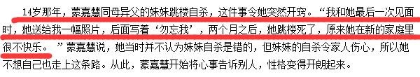 最让人没想到的是,蒙嘉慧妈妈和继父离婚后,她的妹妹跟着亲生父亲生活,结果继母对她不好,她妹妹想不开跳楼自杀了,这件事对她的影响很大。