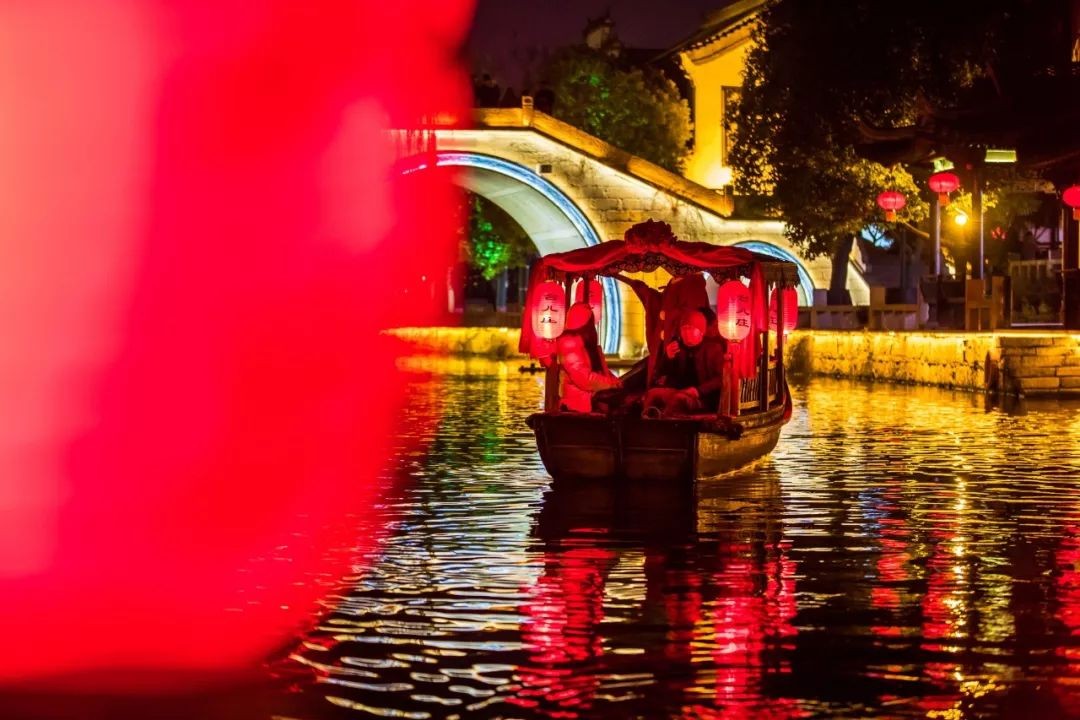 随着夜色降临,台儿庄古城慢慢进入了梦幻时光,水巷汪塘、古街石桥、亭阁楼台在夜幕下被灯光映衬得如诗如画。