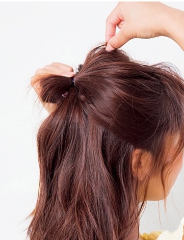 齐刘海向前,可以用卷发棒稍微夹一下,营造内扣感觉,然后将后面的头发分成两部分,上面的部分用橡皮筋对折扎起来。
