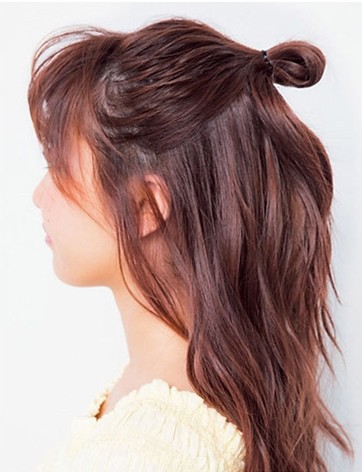 时尚看点:甜美气质的这款半扎丸子头发型十分惹人爱哦,搭配齐眉的空气刘海既衬托出迷人的双眼又凸显出一张可人的鹅蛋脸,而那脑后那半扎丸子头与散落的微卷长发搭配,轻轻松松就彰显女生的甜美范儿,叫人不得不着迷。