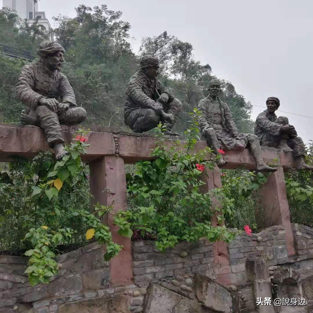 街头矗立着一节绿皮火车,旁边是极富时代特色的民众排队乘车场景,古镇紧挨着火车铁轨,偶有飞驰而过的绿皮火车,仿佛时光倒流,沿街还原有不少旧时的众生像雕塑。
