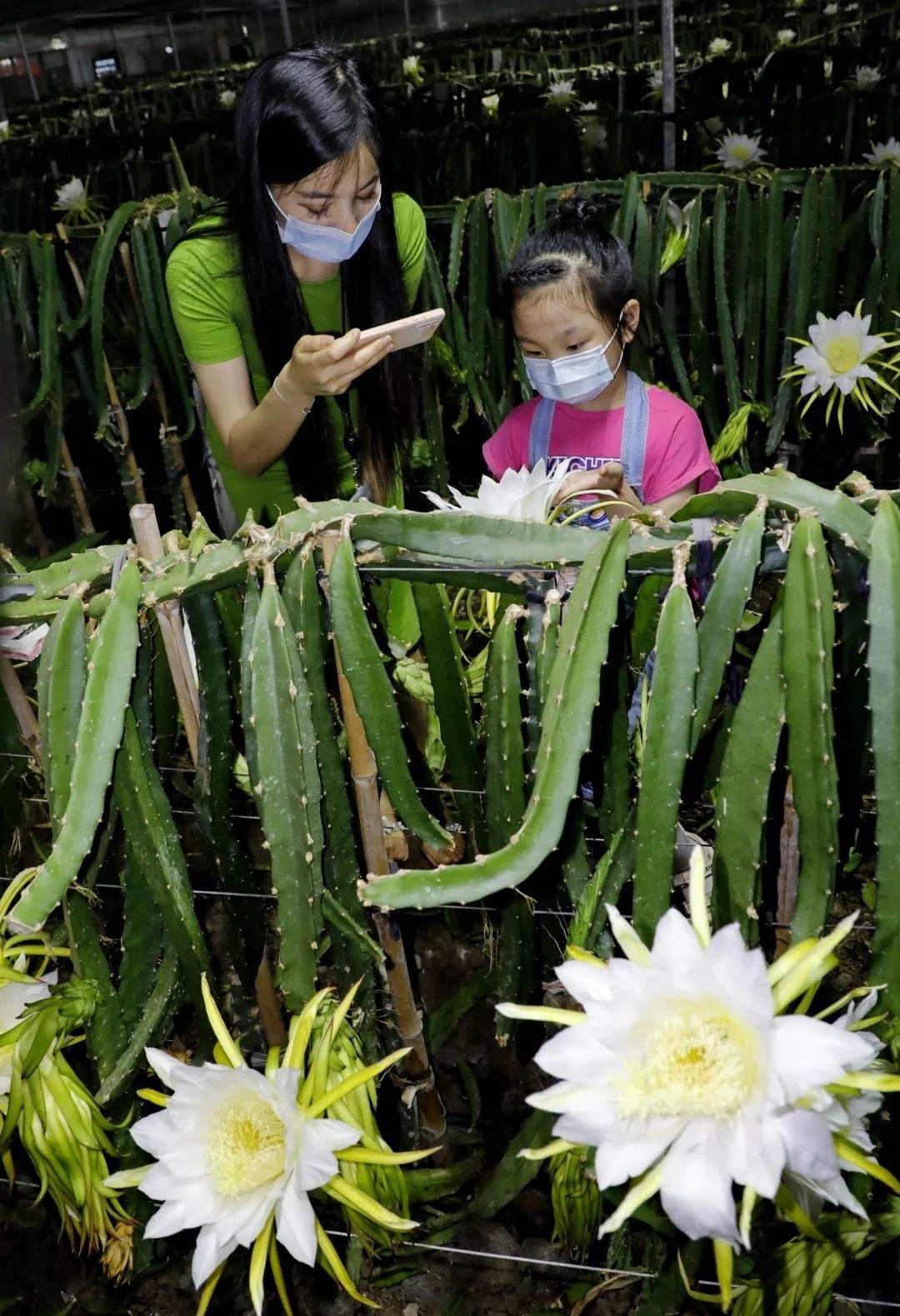 7月4日晚上8点,在金山区吕巷镇上海绿田蔬果种植专业合作社的大棚里,朵朵洁白的火龙果花已经开始争奇斗艳,竞相绽放。