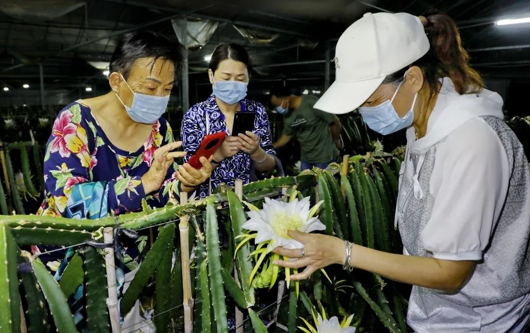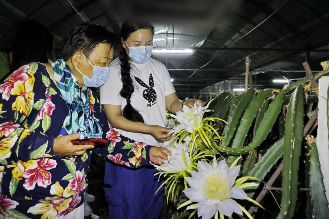 火龙果花又被称为“夜仙子”,只在夜间绽放,花期只有短短几个小时,等待天亮硕大的花苞就会收拢。在这短短的几个小时里,工人们还要抓紧时间对所有的花朵进行人工异株授粉,保证火龙果后期的生长结果。