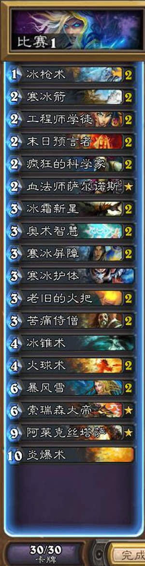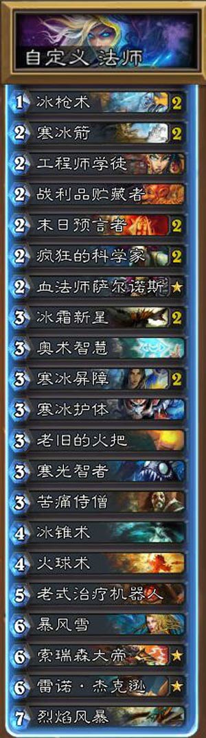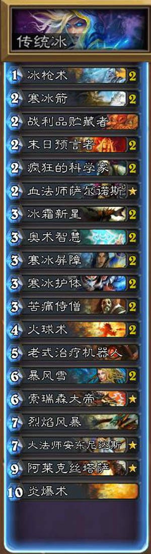 传统冰法以卡牌大法师安东尼达斯为核心,通过法术牌触发得到一连串的“火球术”卡牌,其汹涌的爆发力能在后期积累瞬间作用,让对手难以应对。不过这种传统冰法需要特别注意在前期苟活,并通过一系列卡牌进行解场,创造机会过牌,之后大帝减费,红龙喷,安东尼刷火球,继而进行斩杀,可以说一套整体节奏偏慢的中后期卡牌组。