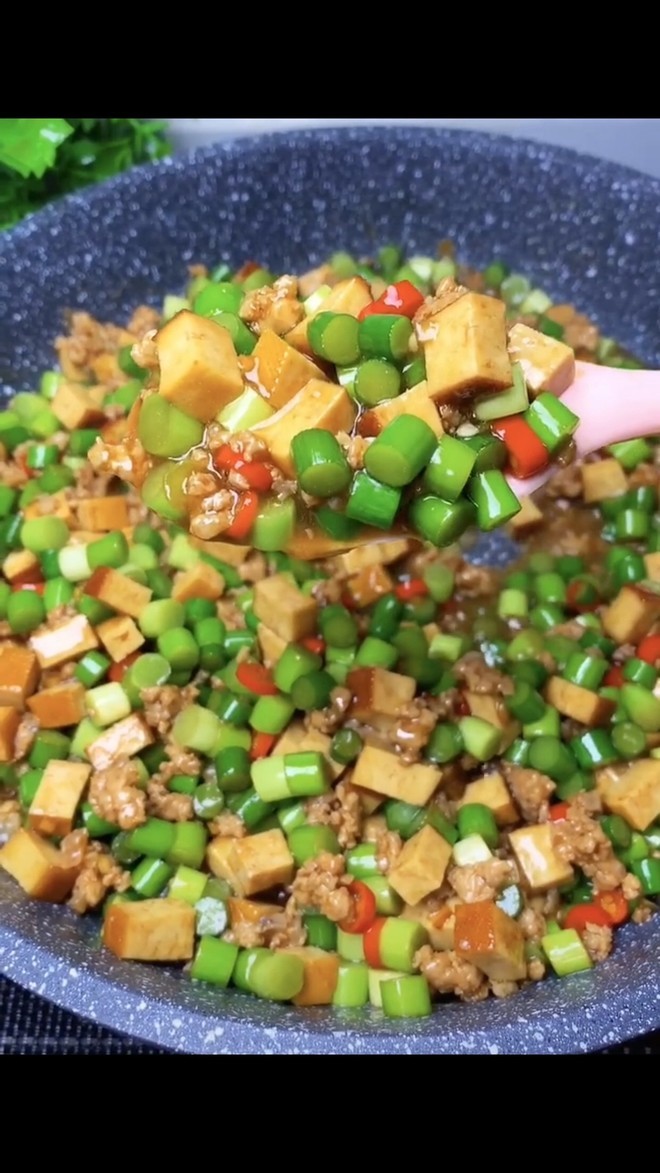 做法:豆干、蒜薹洗净切丁。锅内热油,加入切好的肉末,翻炒变色后锅内留油捞出备用。留油的锅内放入葱、蒜、辣椒爆香,依次放入肉末、豆干丁、蒜薹丁,翻炒均匀,加入生抽、老抽、耗油与适量的盐与鸡精,炒熟之后加入适量淀粉水勾芡,过一分钟左右就可以起锅啦!配上大米饭,营养又美味哦!