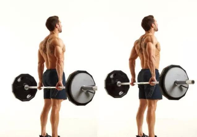 如何做:手握适当重量的杠铃,双手握住的距离刚好超过肩宽,让杠铃在你腰前并保持手臂伸直,背部自然弯曲,臀部前倾约10度,双膝微微弯曲。现在,尽量把你的肩膀耸肩耸至耳朵,手臂在运动过程中同要保持伸直,停留片刻,返回至起始位置。