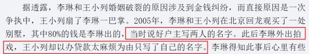 但是因为那段时间,李琳要进组拍戏,没时间管便全权委托给丈夫去办,然而最终房本到手却只有王小列一个人的名字。