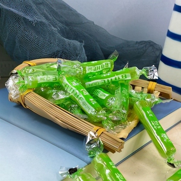 薄荷棍:小时候两分一个。两片糖可以像按扣一样互相扣上,有孔。放进嘴里,没化完之前可以"局局局"地吹几分钟。那时,弄到哨子糖可神气了。一定得在听众最多的场合放进嘴,真正的一边吃一边吹,吹得邻居大娘出门见了我就翻白眼。后来那个“暴露薄荷糖”就是模仿这个造型来的。
