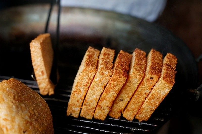 蛋烘糕在很久以前,是由炉子烘烤的。可是,现在街上能见着的都是用液化气的,少了很多以前的味道。不过,还是很知足,在街上还是偶尔能遇见拖着三轮车买卖蛋烘糕的身影。除了白糖以外,炒好的土豆丝、青椒肉丝、榨菜,各种水果酱也可以作为馅。味道简直就可以琳琅满目。