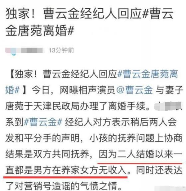 据悉两人在18年2月结婚,4月产女,如今还不到两年就离婚了…这波操作真是够快。相比曹云金的和平分手,他经纪人回应两人真正的离婚原因才最让人气愤,因为二人结婚以来都是曹云金在养家,而女方没有工作没有收入