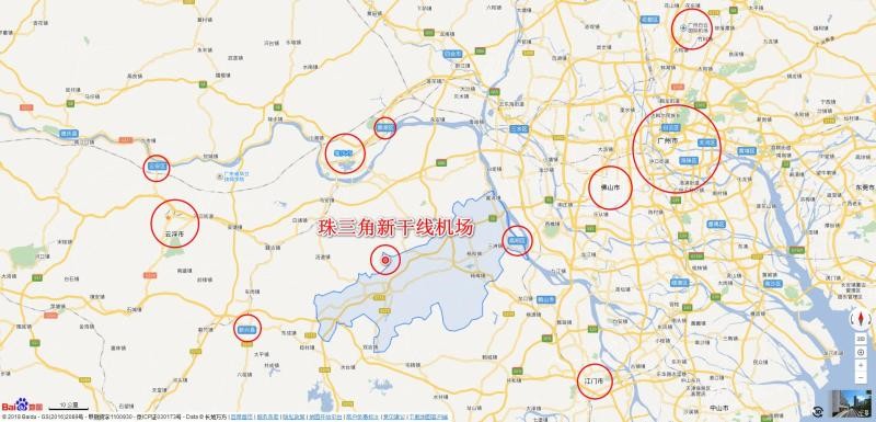 珠三角新干线机场:在建,预计2022年建成通航。珠三角新干线机场位于广东省佛山市高明区更合镇新圩社区与肇庆市高要区蛟塘镇交界,是广东省重点打造“5+4”骨干机场之一,与广州白云机场共同形成国际航空枢纽(规划中还有广州正果国际机场,南沙商务机场),主要服务珠三角中西部及周边地区,积极发展国内国际航空客货运输。