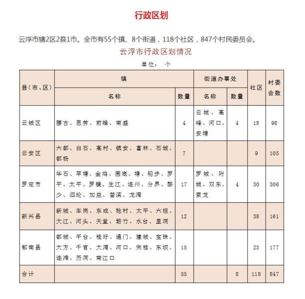 截止2014年,云浮市辖云城区,云安区,新兴县,郁南县,代管罗定市,云浮市面积7779平方千米,常住人口236万。