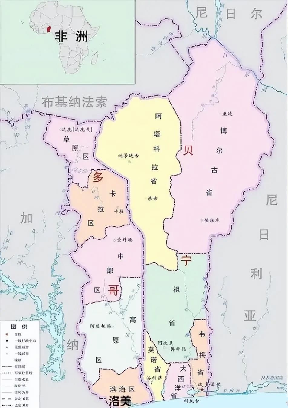 该国的矿产资源相对较少,主要有铁矿石、石膏、黄金、磷酸盐和石灰石等,且大多数未得到技术开发。 2022年,贝宁的GDP为17.41亿美元,排名全球第123位,相比之下,中国排名世界第2。该国支柱产业主要为农业和转口贸易,农业从业人口约占总就业人口的70%,主要作物包括棉花、腰果、油棕榈等。贝宁也是一个重要的转贸中心,与法国、尼日尔和尼日利亚等国家有着密切的贸易往来。 在文化方面,贝宁人重视长幼尊卑的次序,晚辈需尊重长辈。该国的铁路总长为685公里,公路网络总长约为6800公里,拥有5个飞机场。然而,该国过高的税率可能对经济发展产生负面影响,且贫富差距较大,许多人生活在贫困中。 尽管贝宁共和国面临一些挑战,但该国仍具有一些独特的地理和经济特点。贝宁共和国——非洲的彩色国度 贝宁国旗采用红黄绿三色,被誉为“泛非洲颜色”,象征着非洲人的团结和希望。红色代表祖先鲜血,黄色代表平原,绿色代表棕榈树。