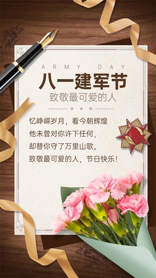 10、有一首歌,叫“军中绿花”,歌声悠悠,情意浓浓;有一段情,叫“军旅之情”,战友之情,天长地久;有一个节,叫“八一建军”,真心祝福,问候传递!