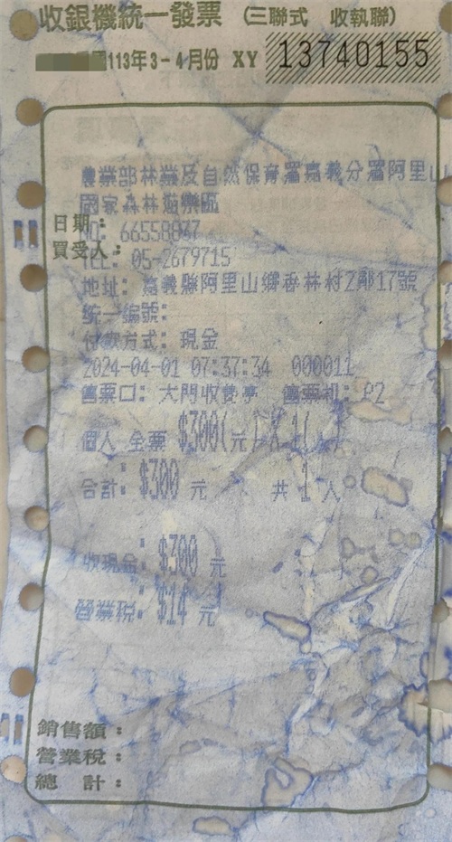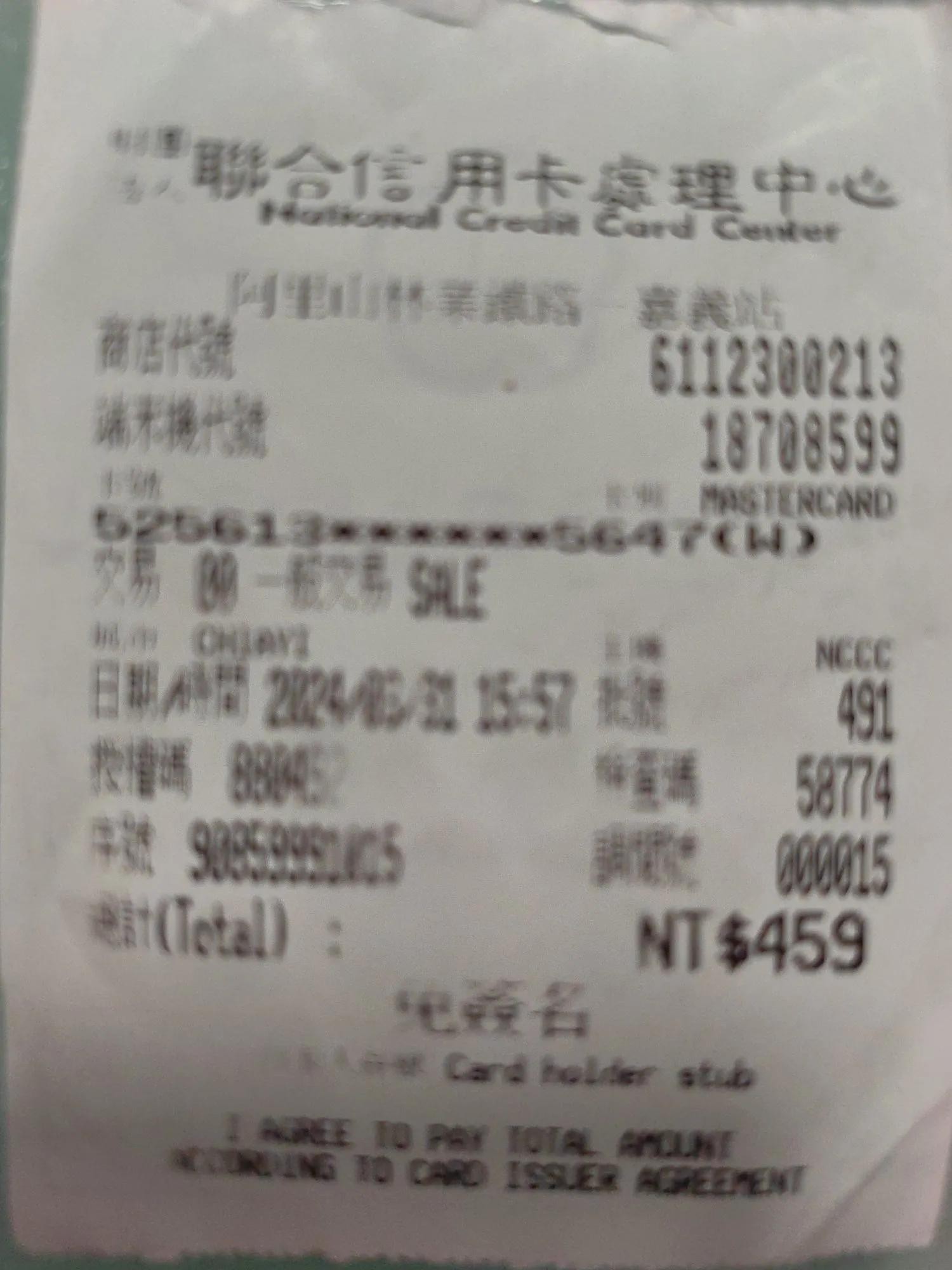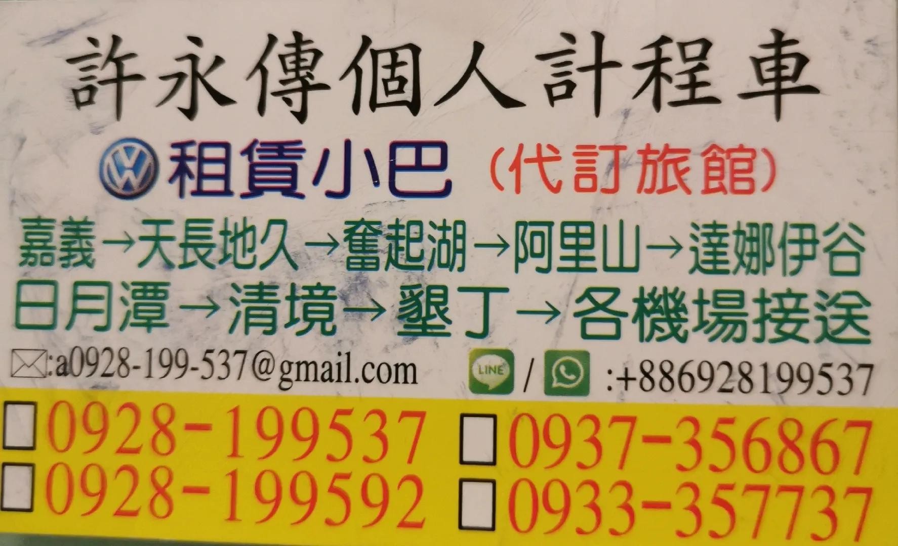 然后向服务员求助联系去阿里山的计程车。服务员很热情,用闽南话打了两个电话,第一个要价5000元新台币且只能早上8点后出发(去阿里山时间太紧了)。第二个要价4000元新台币,一辆7座计程车,明天早上6点来宾馆接我,下午负责把我送到阿里山返回嘉义的小火车站,定好了第二个。我身上的新台币已经不够用,去附近的一家银行又用工行卡从ATM机上取了3000元新台币。