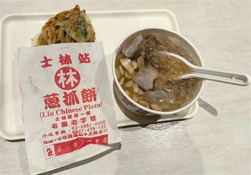 离开博物院后我坐上公交(台湾叫公车,可刷一卡通),与一位60多岁的男士同坐一排,我发现乘客若在下一站下车需提前按铃告知司机,否则如果没有上车的到站不停,同坐得知我是从大陆来的非常热情地说到站前他帮我按车铃。我在士林捷运(地铁)站下车后,在中正路一家名为粉圆豆花的小吃店,要了一份葱抓饼和一碗甜汤,美美的吃了一顿。
