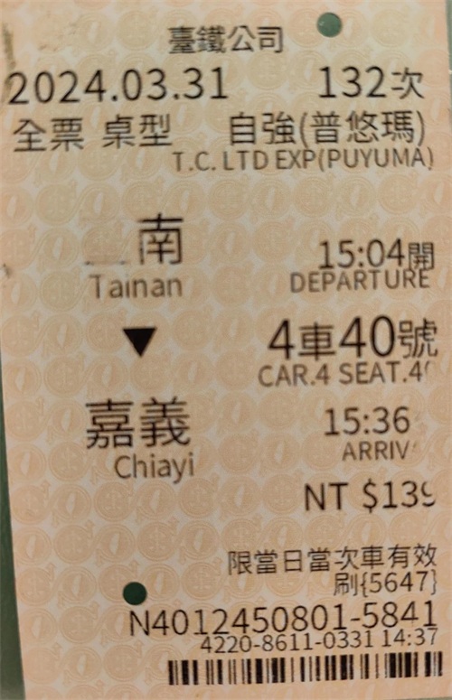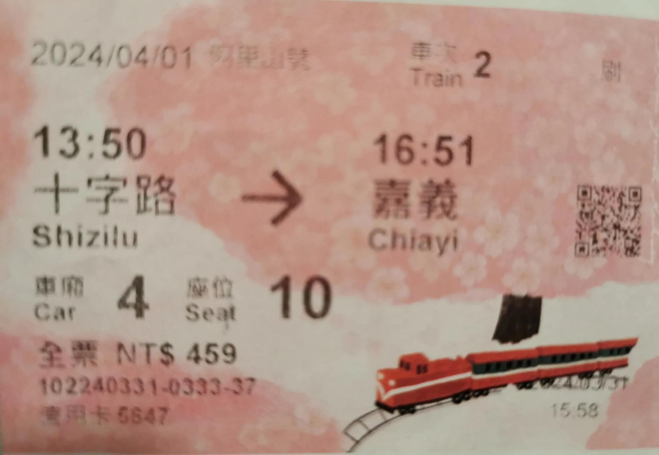 给服务员讲我明天想坐小火车去阿里山,她让我赶紧去火车站购买车票,说下午4点半就停止售票了。我大步流星赶到售票处,售票员说明天上午去阿里山的小火车票已售完,还有下午阿里山十字路站到嘉义站返程的车票,我买了这趟车的票。