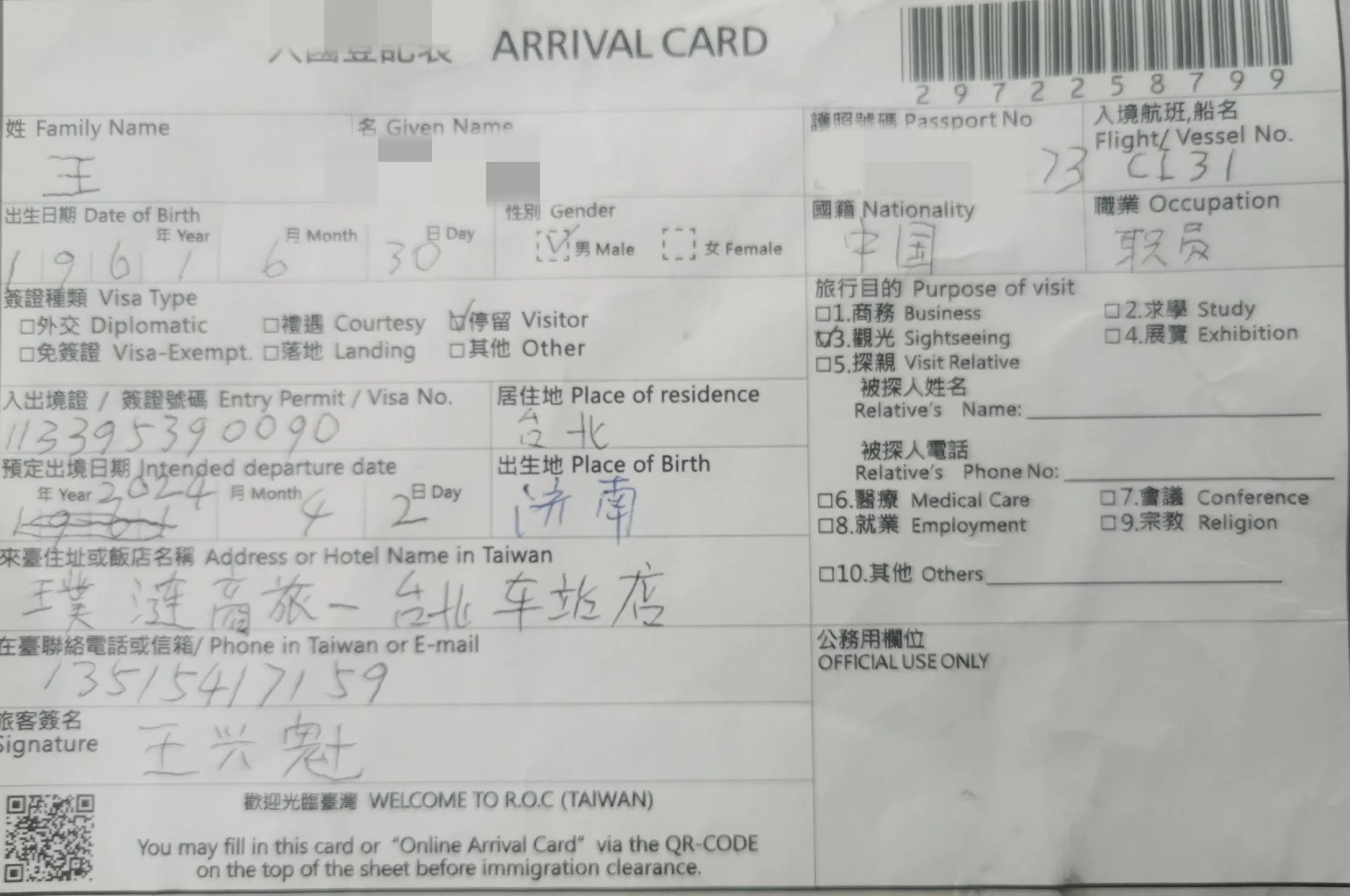 去之前做足了攻略。先从网上联系了台湾一位导游,他说现在没有大团,只有坐4位游客的小车,环岛游8天行程的话,租车费每天1500元人民币,住宿每个房间700元人民币,门票和吃饭另外付。我算了下如果分摊到4个人的话价格不算太贵,但我一个人就太贵了,遂决定个人自由行。从携程上先定好了一家名为璞涟商旅台北车站店的酒店,房价是人民币448.19元(含税费)。从小红书查到了去后的注意事项。出发前几天内,在网上办理参与台湾金福气抽奖活动(奖品选电子凭证),登记护照、到达航班等信息后,生成了一个二维码,截图保存好。