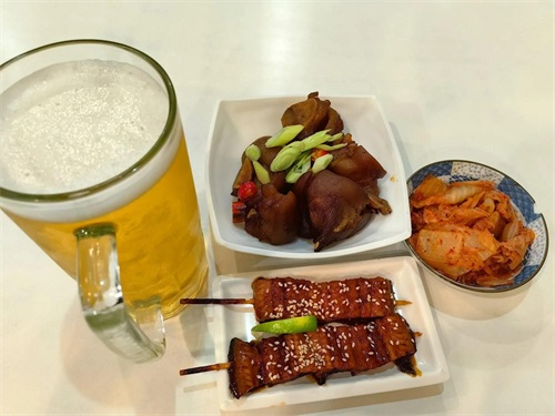 晚上来到台北著名的美食一条街士林夜市逛了逛。回宾馆途中在一家超市用中奖得来的一卡通,支付960元新台币买了些台湾特产,又找了一家小餐馆,在室外一张餐桌上喝了两杯当地产的扎啤,口感挺好的。吃了点佐酒的小菜,花了近300元新台币(两杯扎啤占大头)。