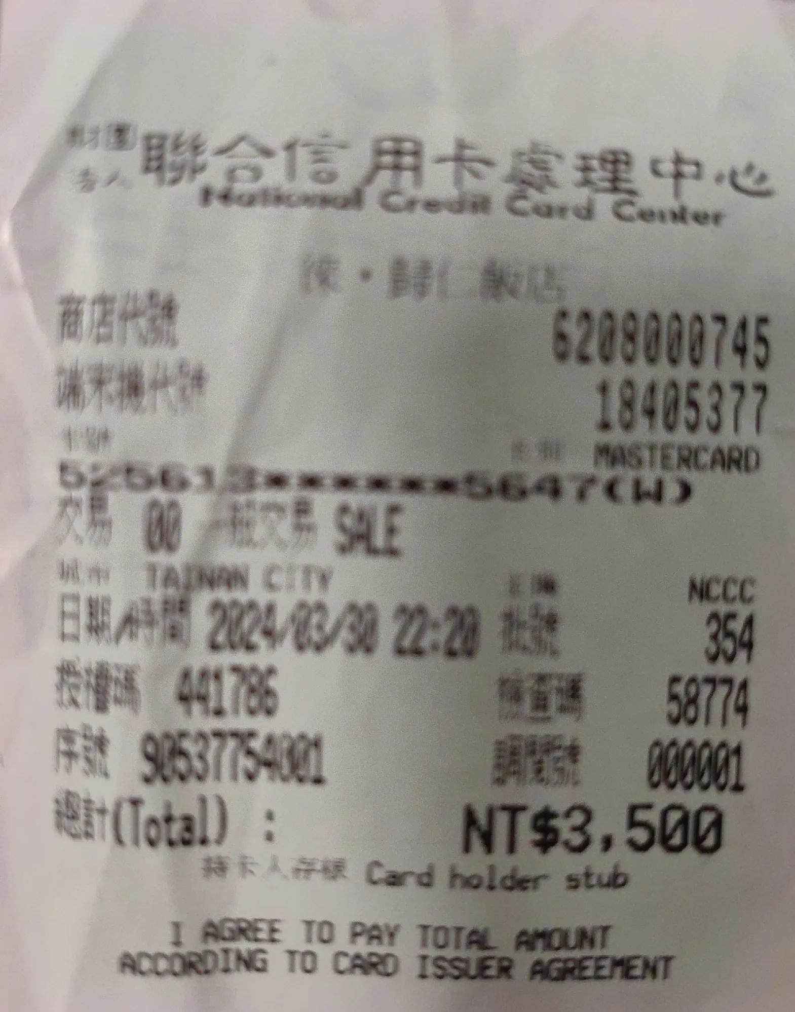 司机将我送到一家名为徕-归仁饭店的宾馆时已是晚上10点20分,前台服务员不知何故说没空房间了,我说这么晚了我也找不到别的住宿地方,若不让住我就只好在大厅沙发上坐一宿了。听到这话给开了一间房,用信用卡支付新台币3500元。