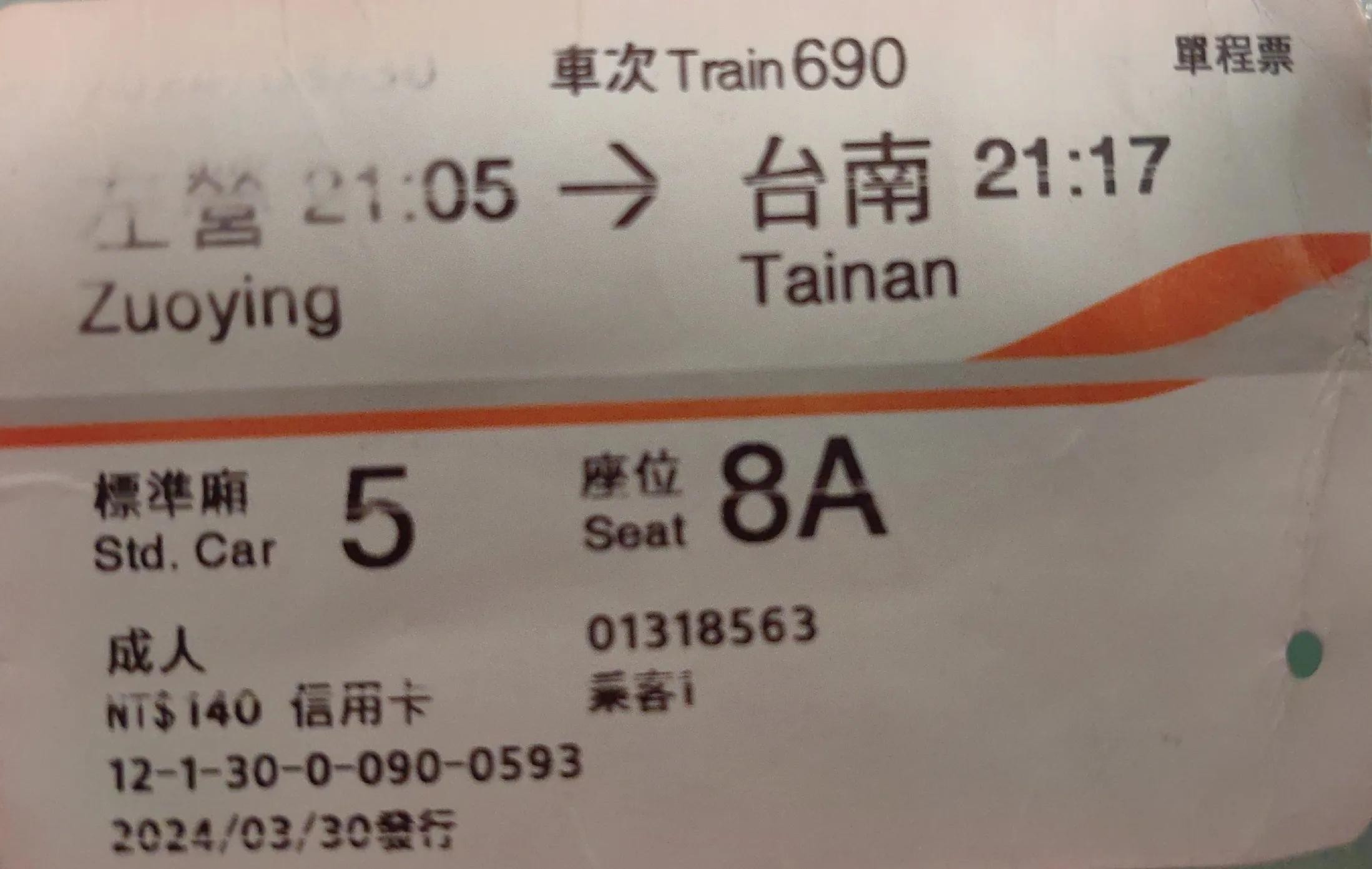 下午6点,我准时骑到租车行还上电动车,然后坐上垦丁到左营高铁站的大巴晚上8点55分到达。还有10分钟就有一辆开往台南的高铁,站内的工作人员热情地帮我用信用卡在自助售票机上买了票,12分钟后到达台南高铁站。