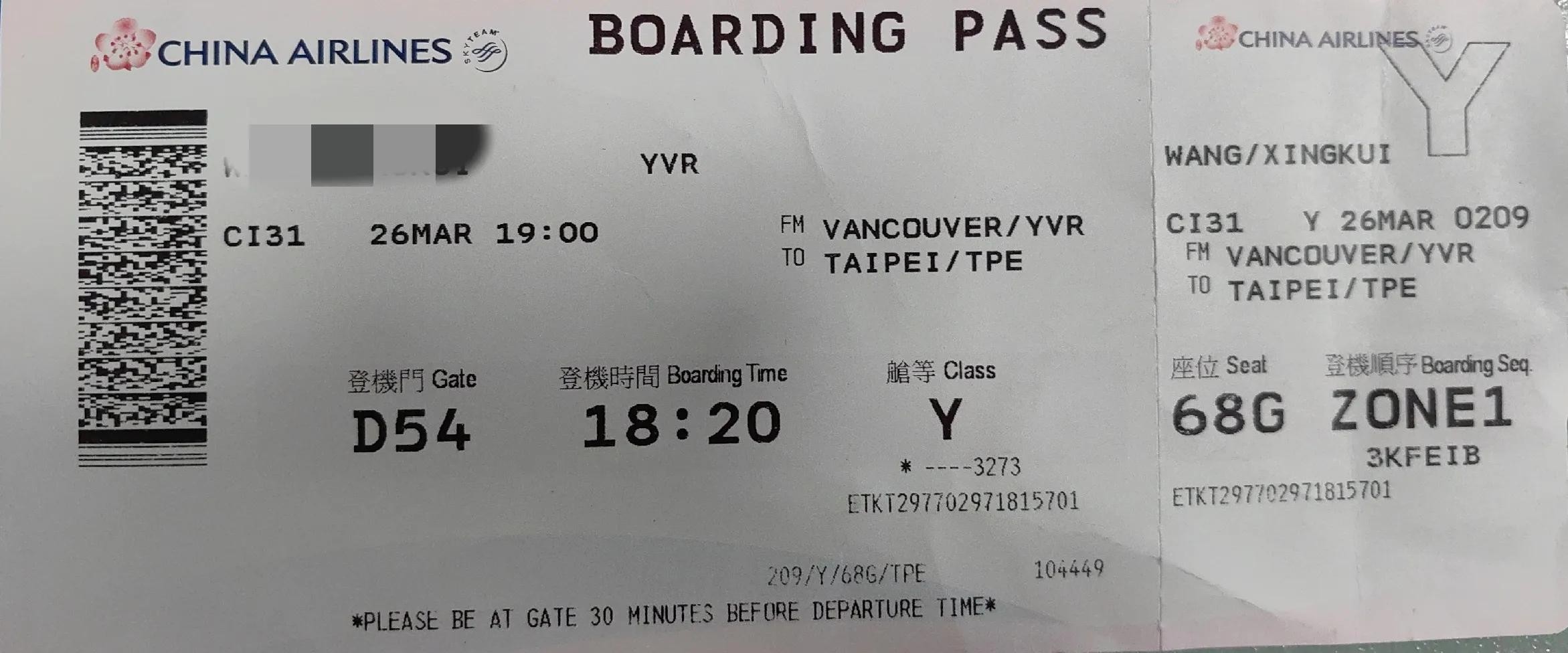 航班原计划是3月27日早上到达台北。在温哥华机场飞机已滑行走一段路后机长广播说飞机有点小故障需要返回检修,在机上等了三个小时后未修好取消本次航班,10个小时后飞机起飞,到达台北时已是晚上10点多。