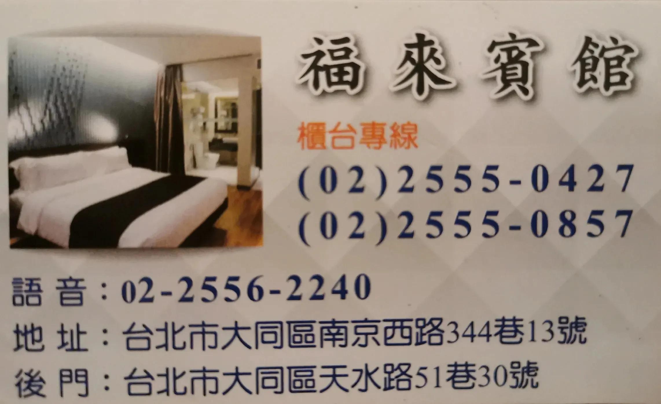 乘地铁回到已退房的酒店,取出寄存的行李后在附近找了一家叫福来宾馆的旅馆,位于台北市大同区南京西路344巷13号。谈好价钱800元新台币一天(折合人民币178元),大床房,设施陈旧但面积较大。宾馆老板夫妻二人均已60多岁,老板不会普通话,老板娘会。