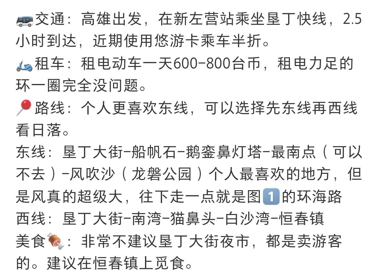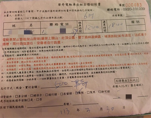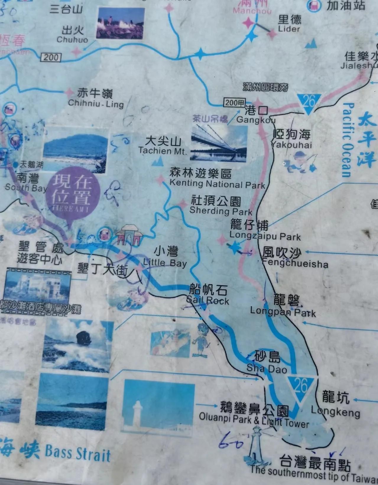 在垦丁派出所站下车吃了一碗面条后找租车行租了一辆两轮电动车,时间从中午12点20分到下午6点,租金500元新台币,工作人员给换上了一块大容量的电池,说骑几十公里绝对没问题,还给了一张游览地图。