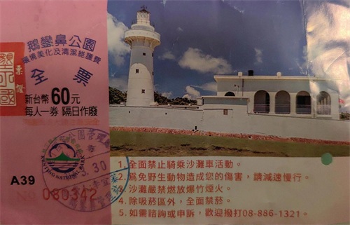 骑上电动车沿着海边游览了垦丁大街、大湾、小湾、帆船石、砂岛、鹅銮鼻公园、亲吻石、台湾最南点、龙坑、龙磐公园、风吹沙、满州乡、龙仔埔、哑狗海、茶山吊桥、福安宫、万法寺、罗峰寺、恒春古城等。途中见到一卖槟榔的商家想买几个尝尝,店老板送我几个没要钱,并热心讲解怎样嚼,这是我第一次嚼槟榔!
