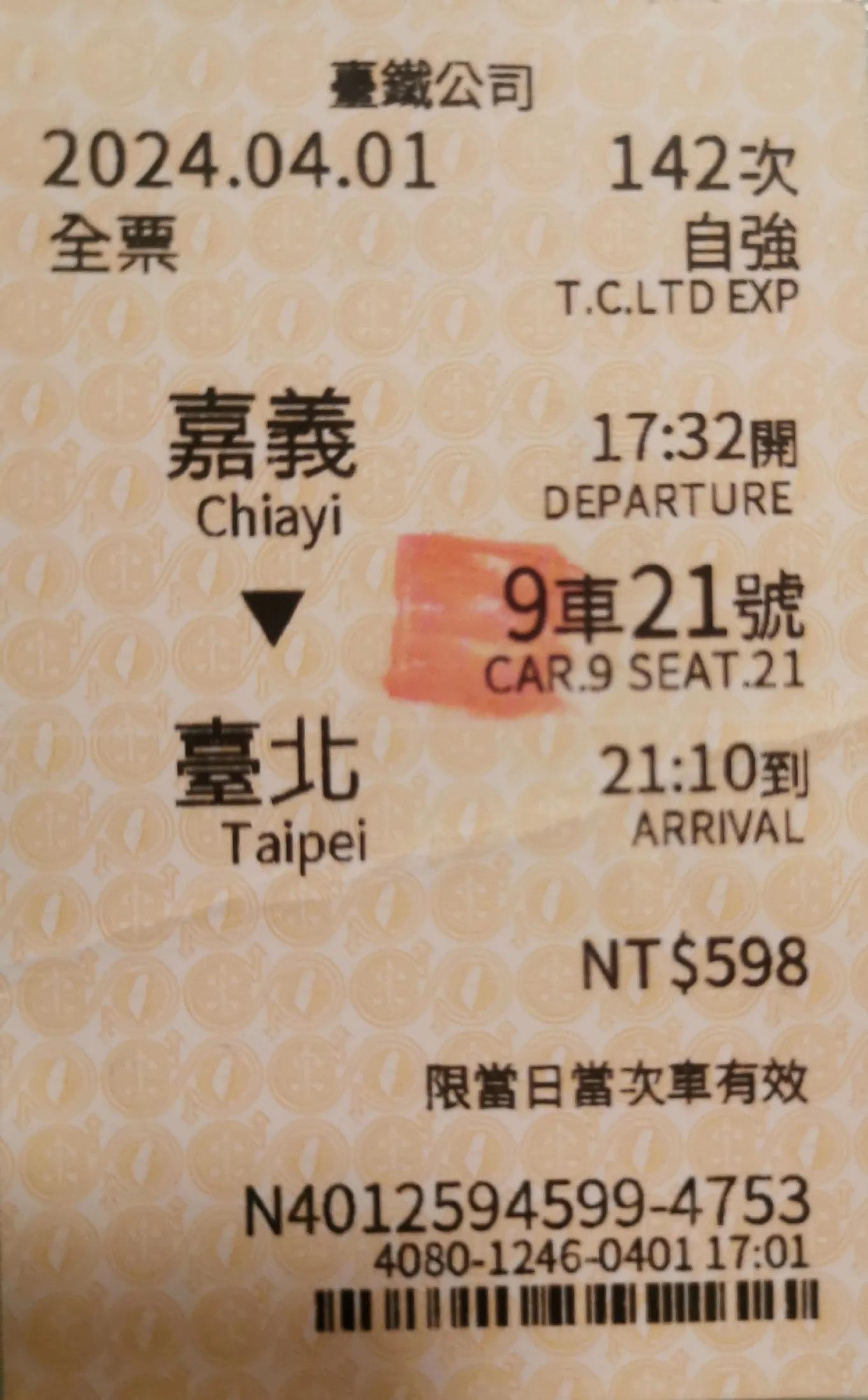 出站后购买了嘉义到台北最近一趟的普通火车车票,运行2小时40分后晚上9点10分到达台北。