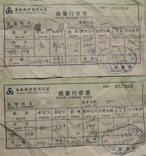 本人在台北桃园机场支付春秋航空公司的行李托运费单据